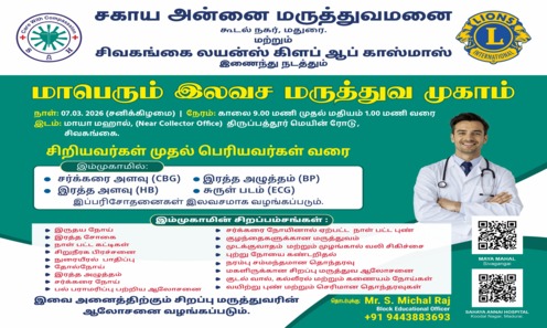 We successfully and effectively conducted our General Medical Camp at Sivagangai on 07.03.2026. The camp was organized by Sahaya Annai Hospital, Koodal Nagar, Madurai, in association with the Sivagangai Lions Club of Cosmos. We express our heartfelt thanks to the Sisters, our dedicated hospital team, and the Lions Club members for their valuable support and cooperation. A special thanks to Mr. Michel Raj for his contribution and support in making this camp a great success.